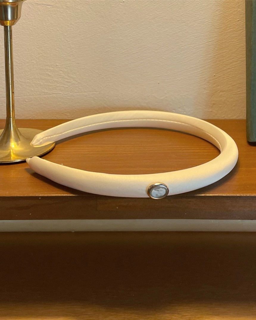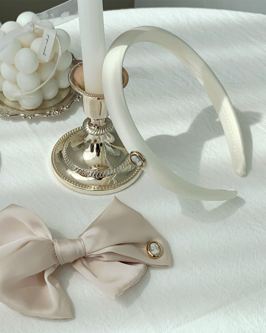 oar 메이드로 빈티지한 무드의 카메오 팬던트가 포인트인 고급 샤틴 소재의 헤어밴드 머리띠로,