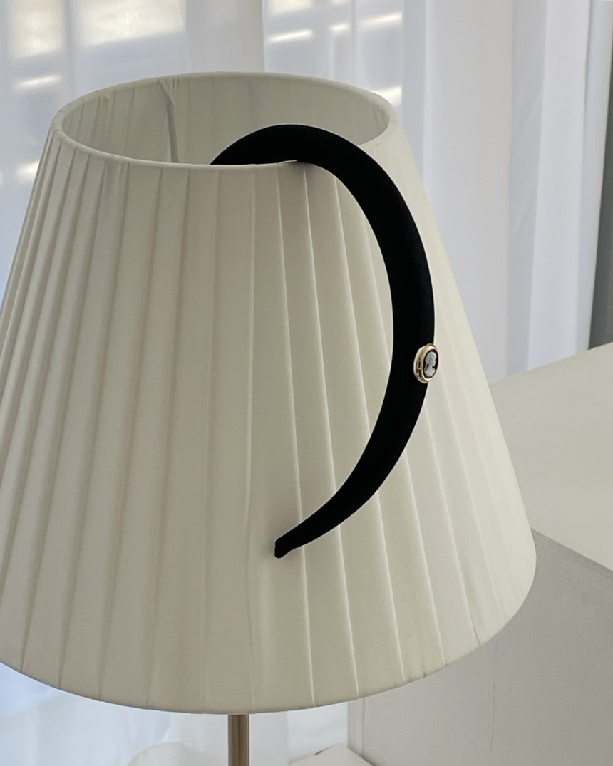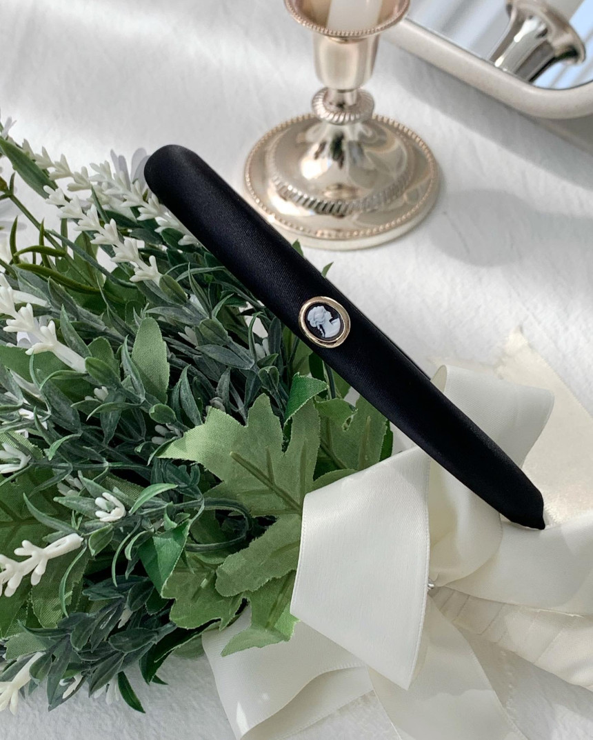 oar 메이드로 빈티지한 무드의 카메오 팬던트가 포인트인 고급 샤틴 소재의 헤어밴드 머리띠로,